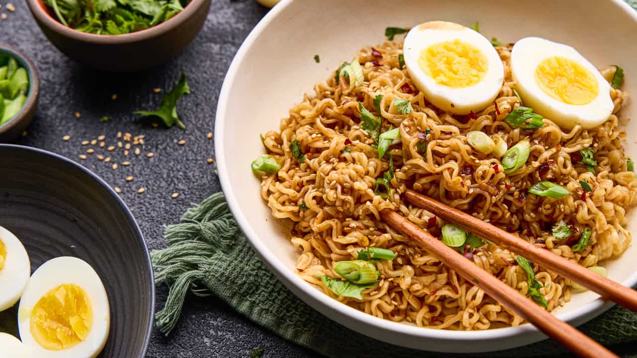 Say goodbye to your customary packaged ramen with a spice pack. This 15 minute ramen is souped up with actual Asian substances like sriracha, sesame, and soy. Served with laborious boiled eggs and a few greens for coloration. These noodles are spicy and scrumptious.