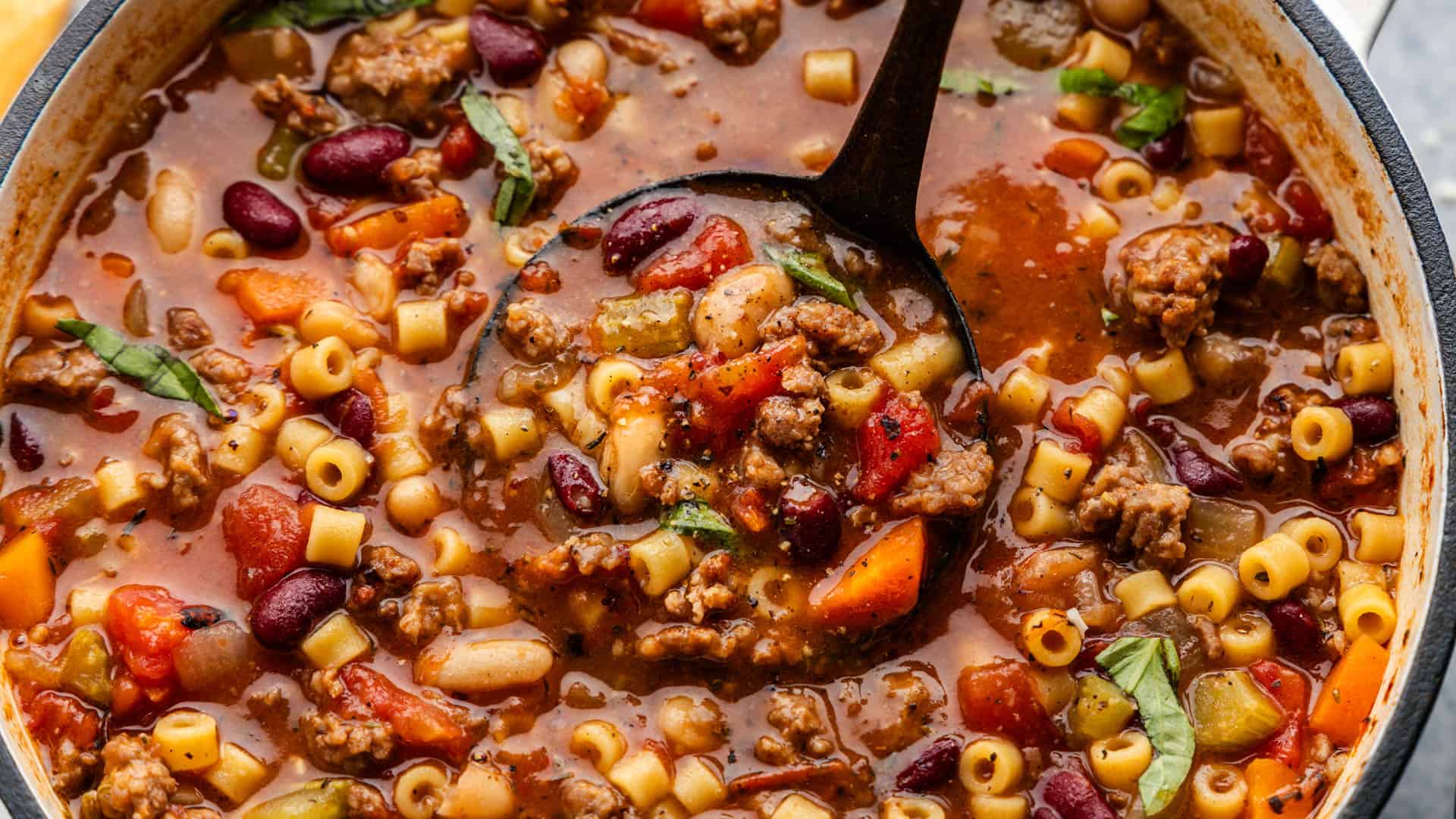 Pasta e Fagioli is an Italian traditional, filled with sausage, two completely different sorts of beans, and ditalini pasta. This hearty, comforting soup delivers massive taste with minimal effort. And, it’s prepared in simply half-hour, making it the proper weeknight dinner while you want one thing fast and filling!