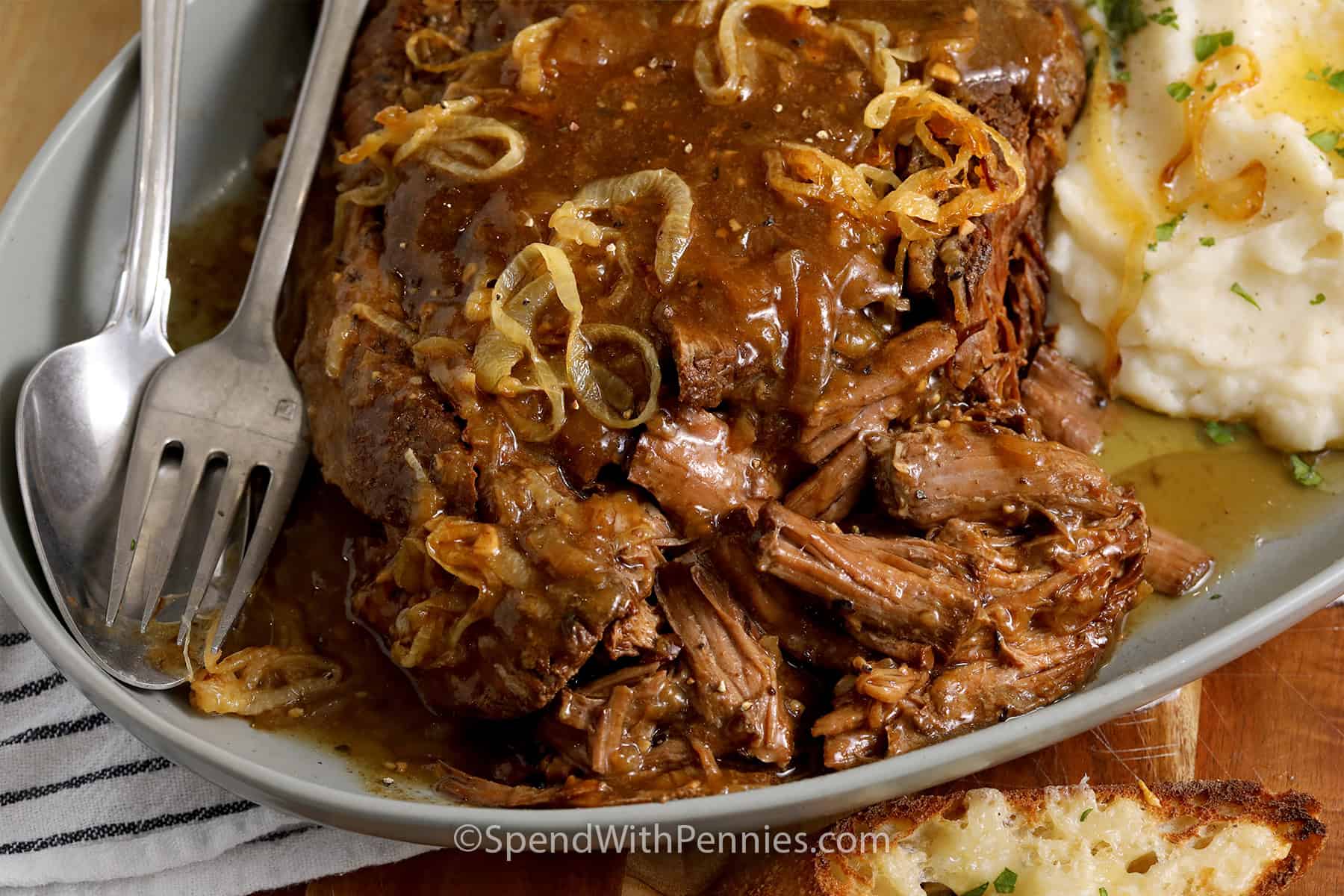 This gradual cooker pot roast recipe is stuffed with taste with tender chuck roast and onions that cook dinner down right into a wealthy savory French onion gravy. We serve it with buttery mashed potatoes and tacky toasts for a straightforward dinner that feels particular.
