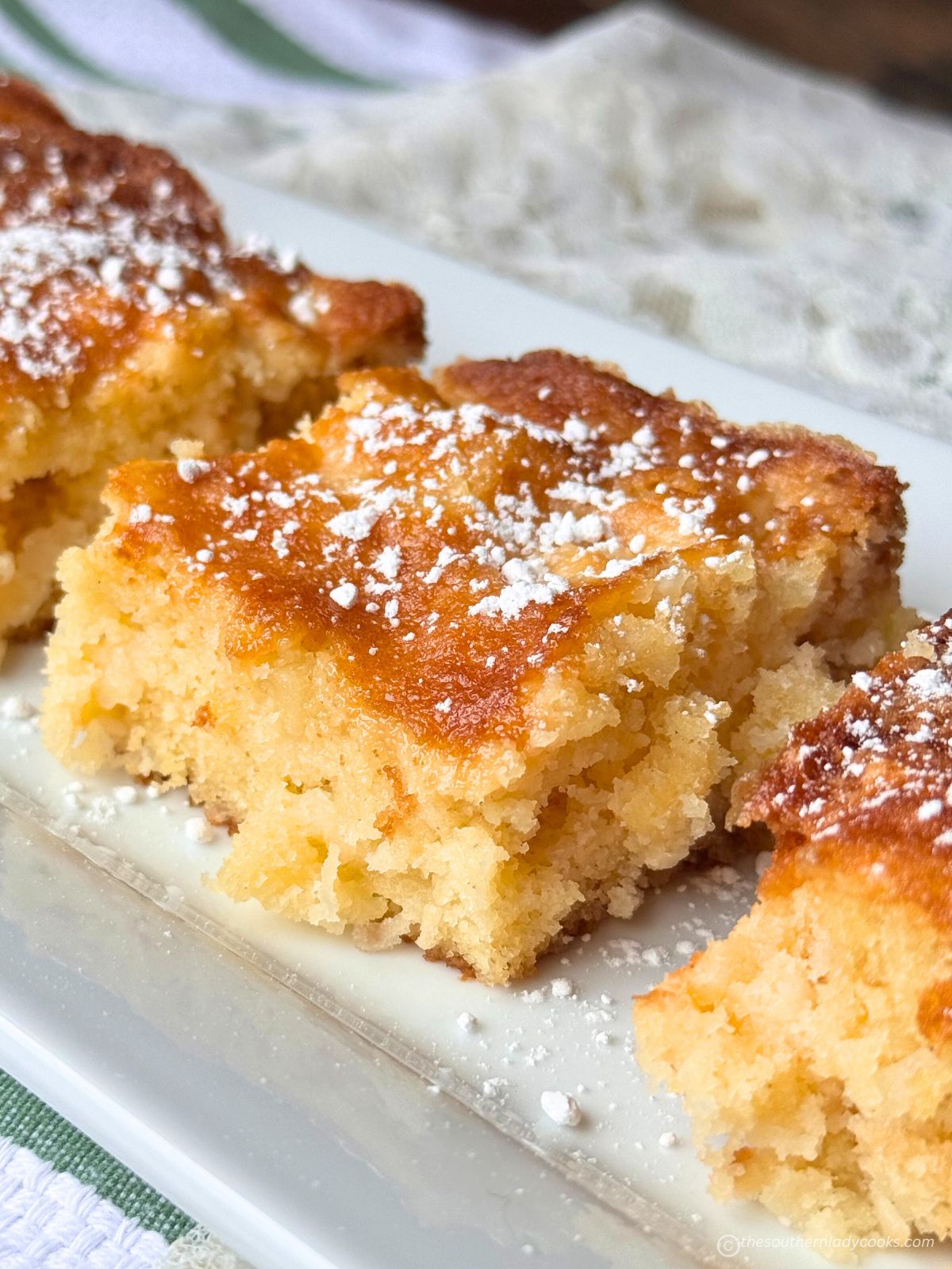 This recipe has just a few components and comes collectively in about half-hour. These bars are additionally nice for a small gathering. They’re made in an 8X8 and are a terrific deal with if you need slightly one thing candy. We like to high these with powdered sugar however you don’t should in case you are not a fan. They’re scrumptious, the highest types a crust and the middle is tender!