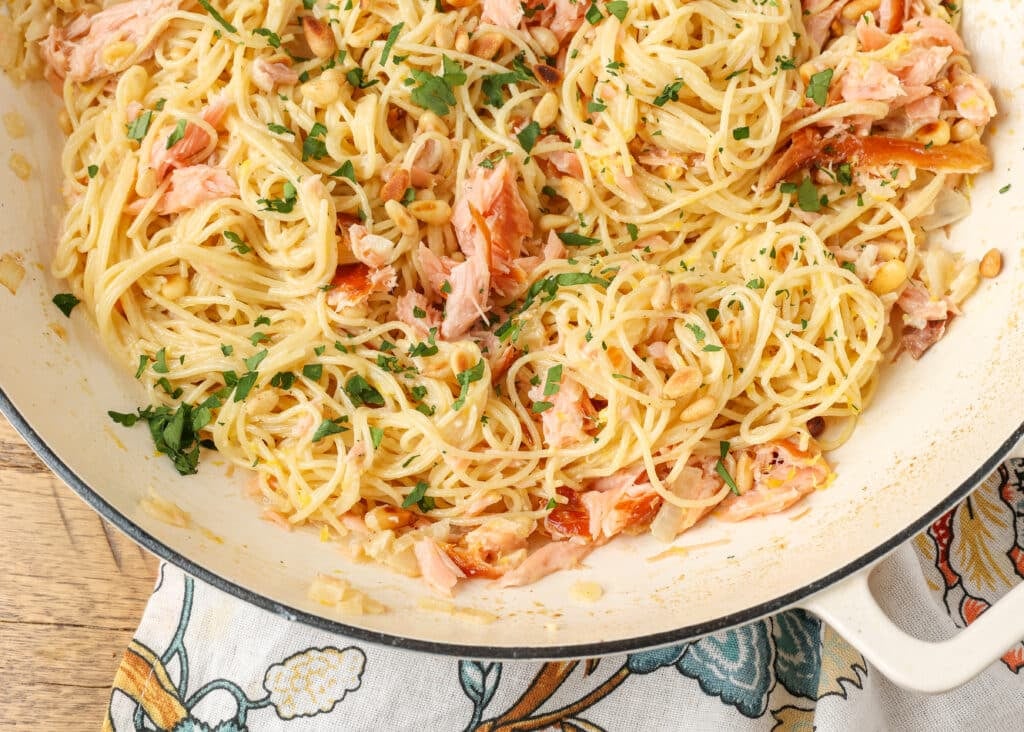 This pasta seems like spring or summer time in a bowl. It’s gentle and lemony with an awesome steadiness of flavors. The lemon cuts via the creaminess, the salmon brings that barely smoky depth, and the pine nuts add simply the suitable crunch.